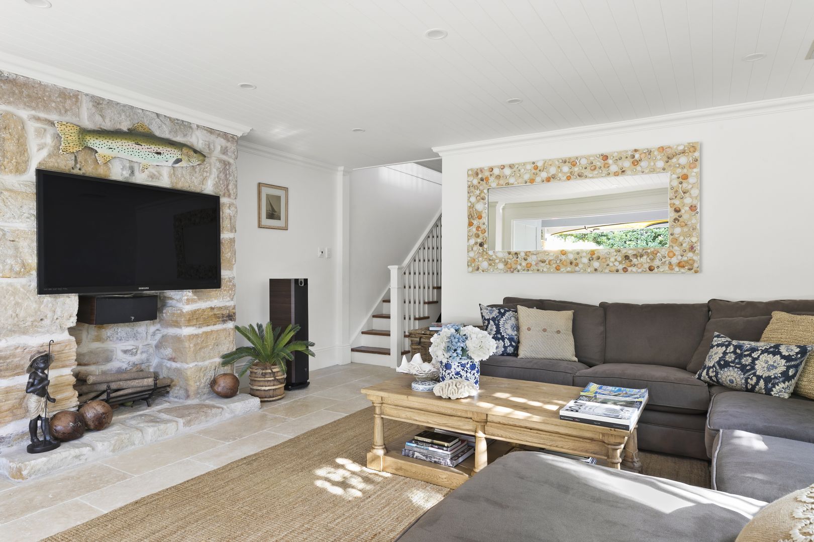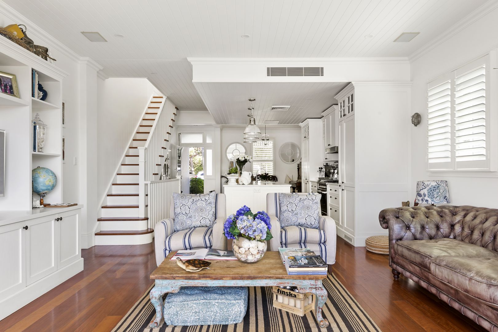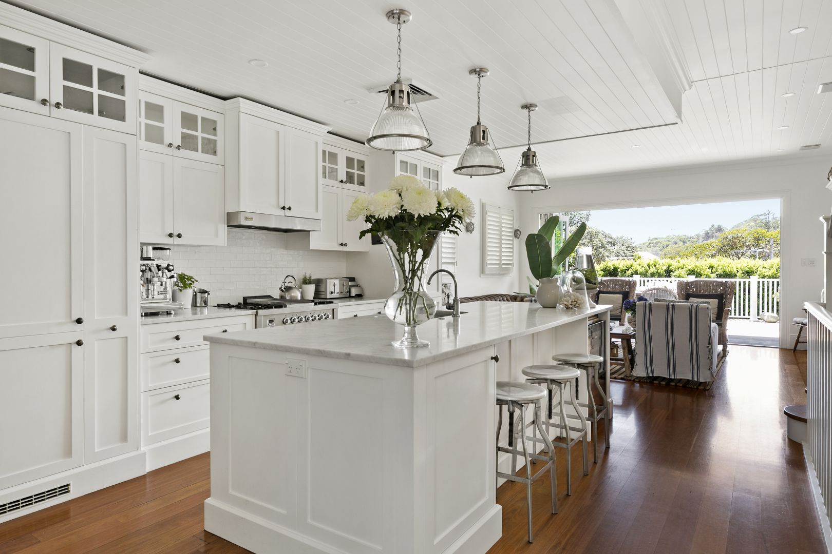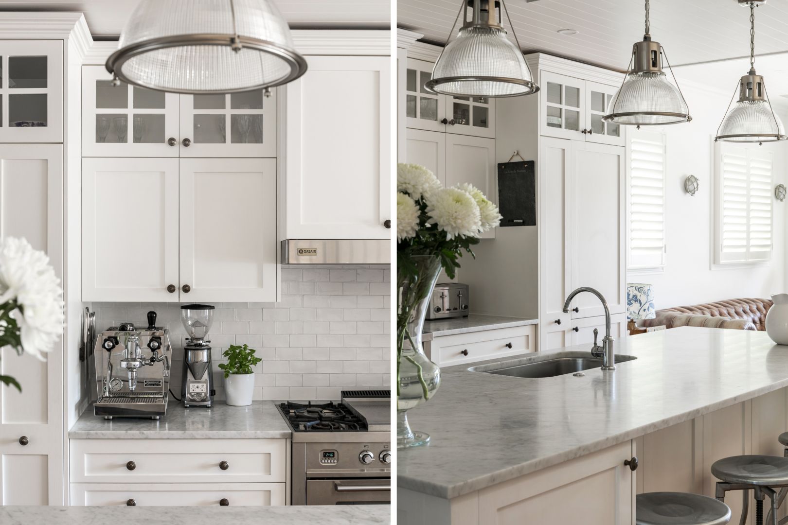 - Airy living area anchored by stunning marble island kitchen