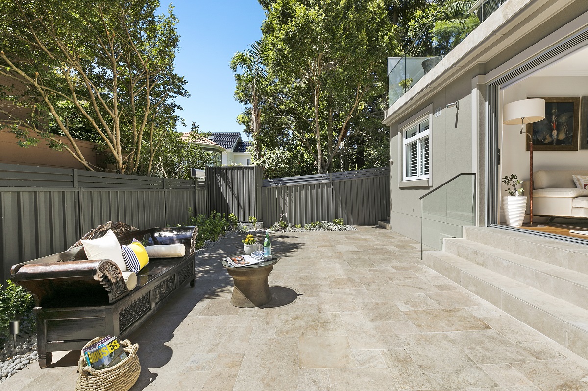 - Travertine entertaining terrace, sunlit landscaped courtyards