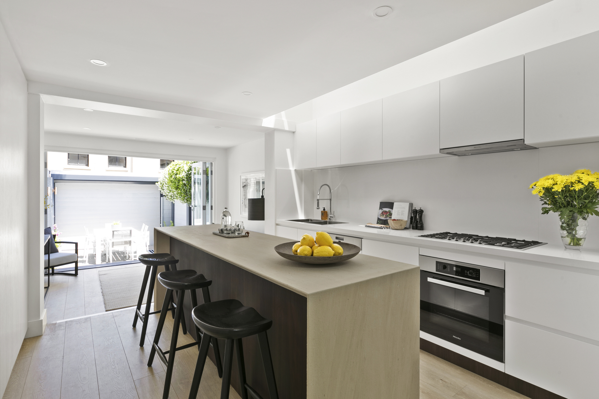 – Integrated Miele kitchen, 5 burner gas stove, stone benchtops